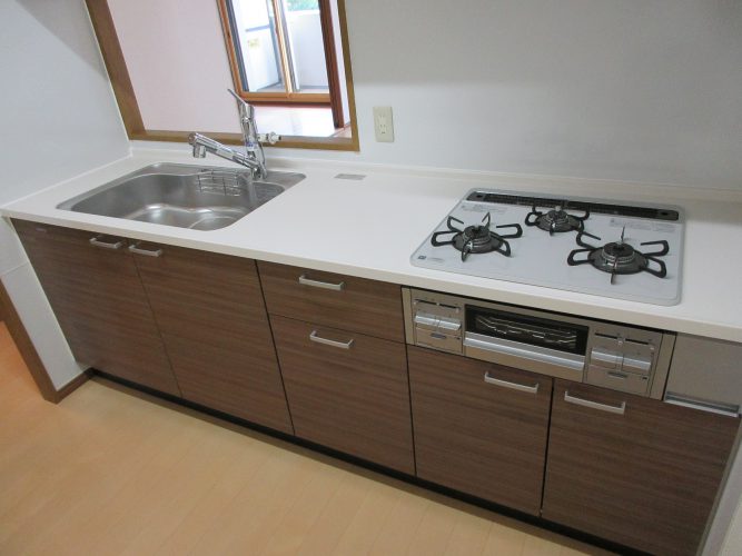 システムキッチン(ガス3口)・追焚き機能システムバス・温水洗浄便座・洗面台交換済